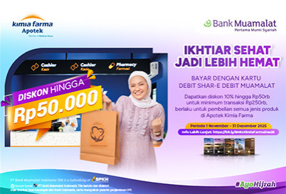 Apa itu promo Potongan Langsung 10% di Apotek Kimia Farma? Potongan langsung 10% maksimal Rp50.000 (lima puluh ribu Rupiah) untuk nasabah yang berbelanja di Apotek Kimia Farma menggunakan Shar-E Debit Bank Muamalat |