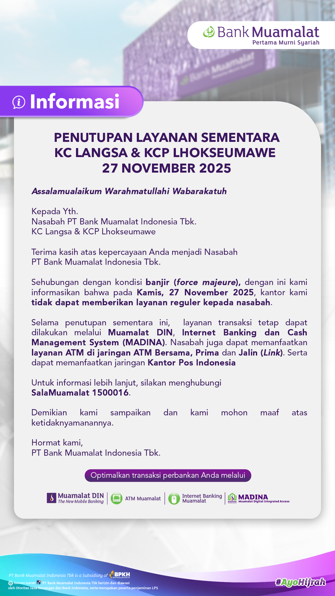 - Penutupan Layanan Sementara KC Langsa - Region Sumatera 26 November 2025