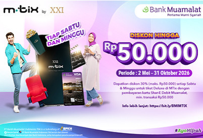 Get a 30% discount of up to IDR 50,000 for a minimum purchase of IDR 50,000 for Deluxe ticket purchases, payment transactions using the Shar-E Debit Muamalat card via the MTix application. |