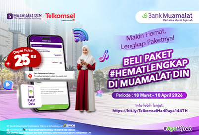 Every purchase of a Telkomsel Complete Value Package with a minimum denomination of IDR 150,000 through Bank Muamalat channels will receive an additional IDR 25,000 in regular credit |